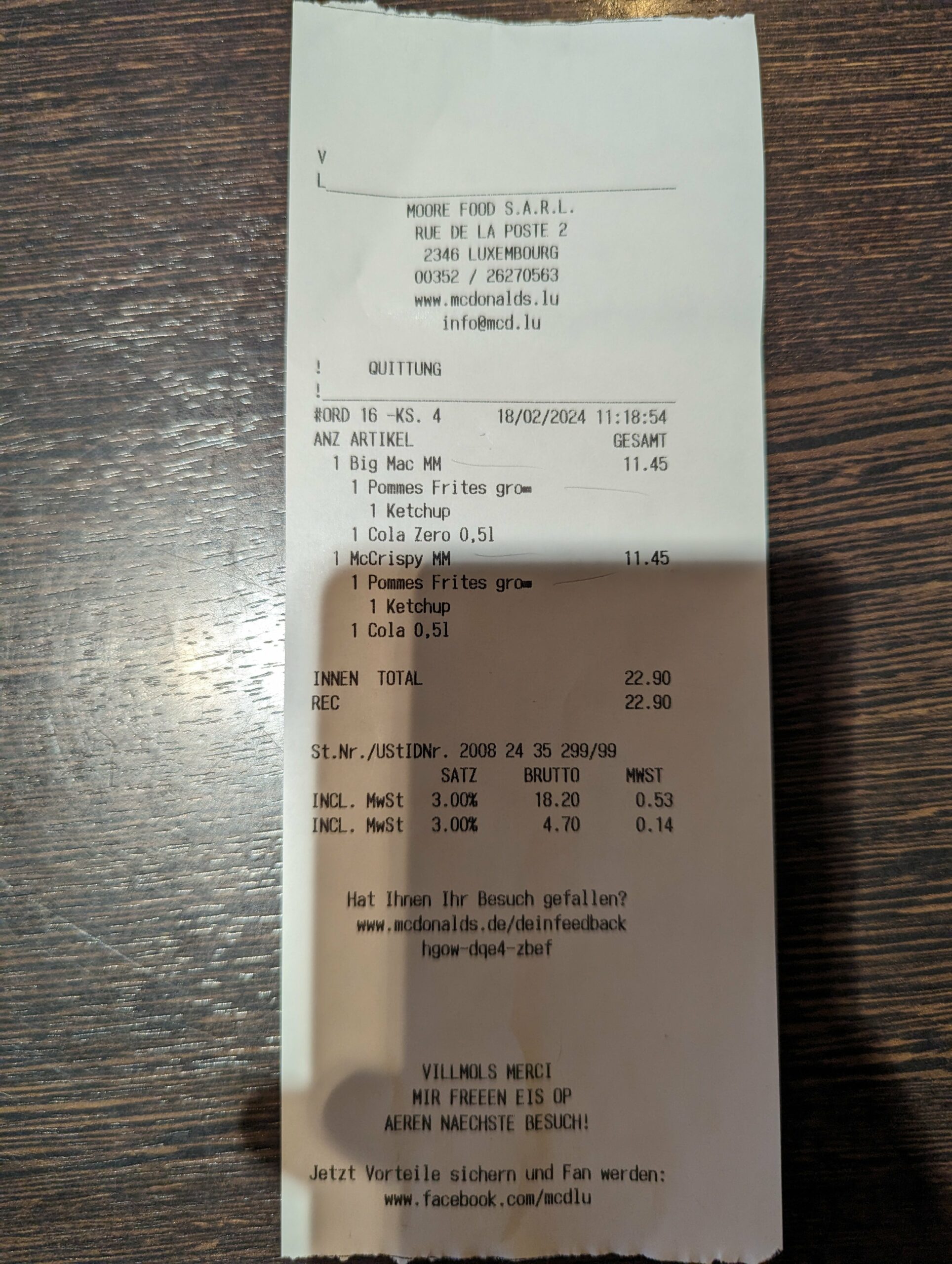 Comments: This place was awful. No kiosks, and the staff were not fluent in English, so had to bust out my high school French. The drinks didn’t have lids, so we had no idea which drink was diet. The service was slow, despite the restaurant being fairly empty. The Big Mac, which didn’t come in the customary red box, had stale bread. And the fries were way too salty. McCrispy was mediocre as well. Only saving grace was that it was open, whereas everything else in Luxembourg seemed to be closed on Sunday.